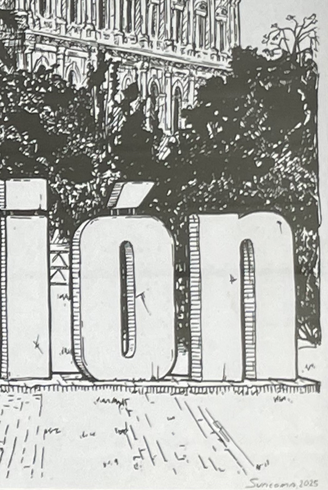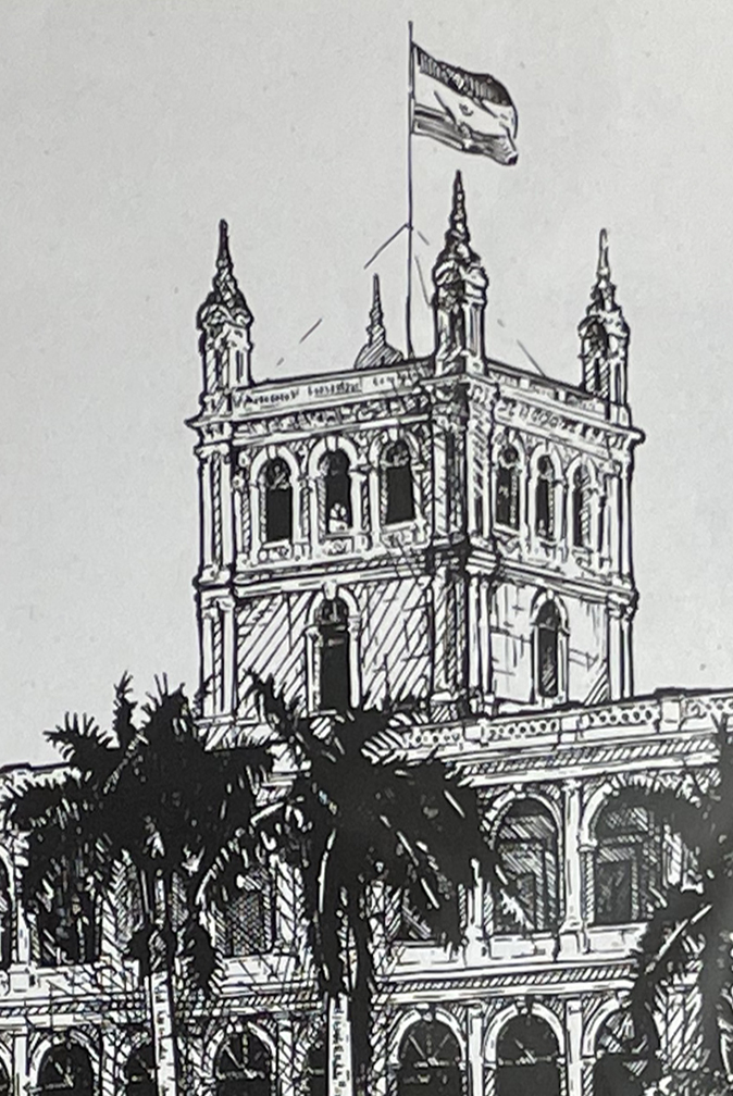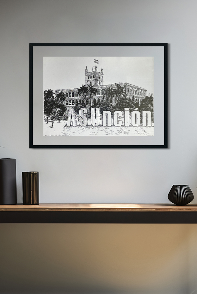 "El edificio más reconocible de Paraguay, un edificio de postal, perfecto para una verdadera veduta. No importa de qué color sea hoy ni de qué lo pinten mañana: en mi gráfica, el color del edificio siempre será el del tiempo presente.