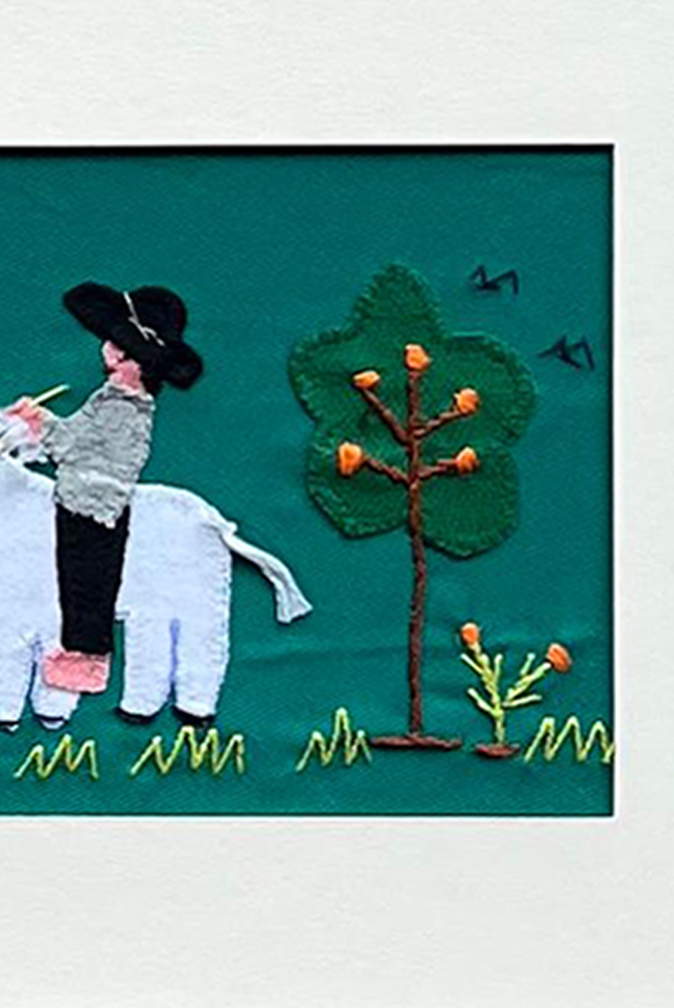 Escenas de paisaje costumbrista realizadas en técnica textil, con aplicaciones de tela y bordado a mano.