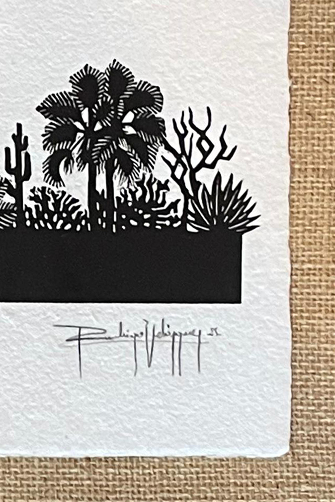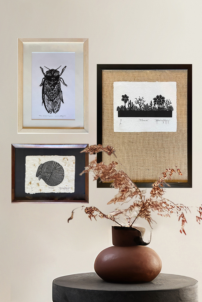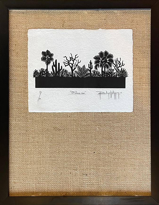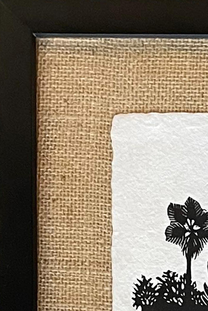 Obra hecha con tinta, con la técnica del grabado sobre un fondo de arpillera.