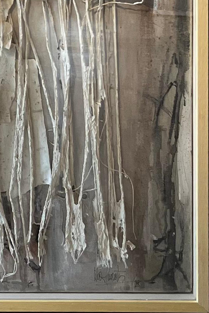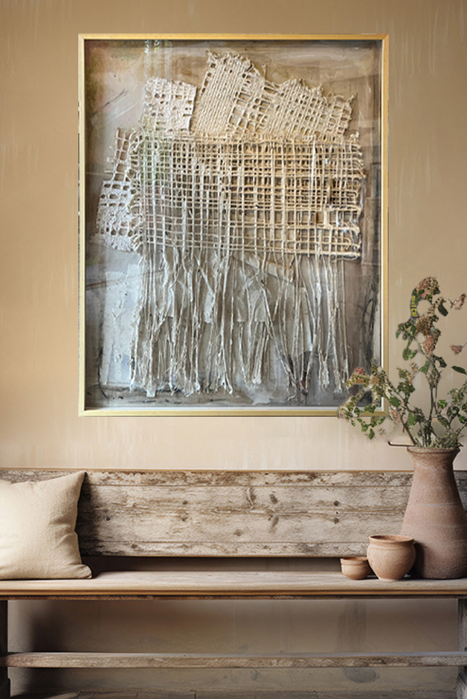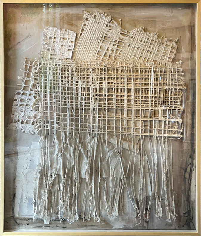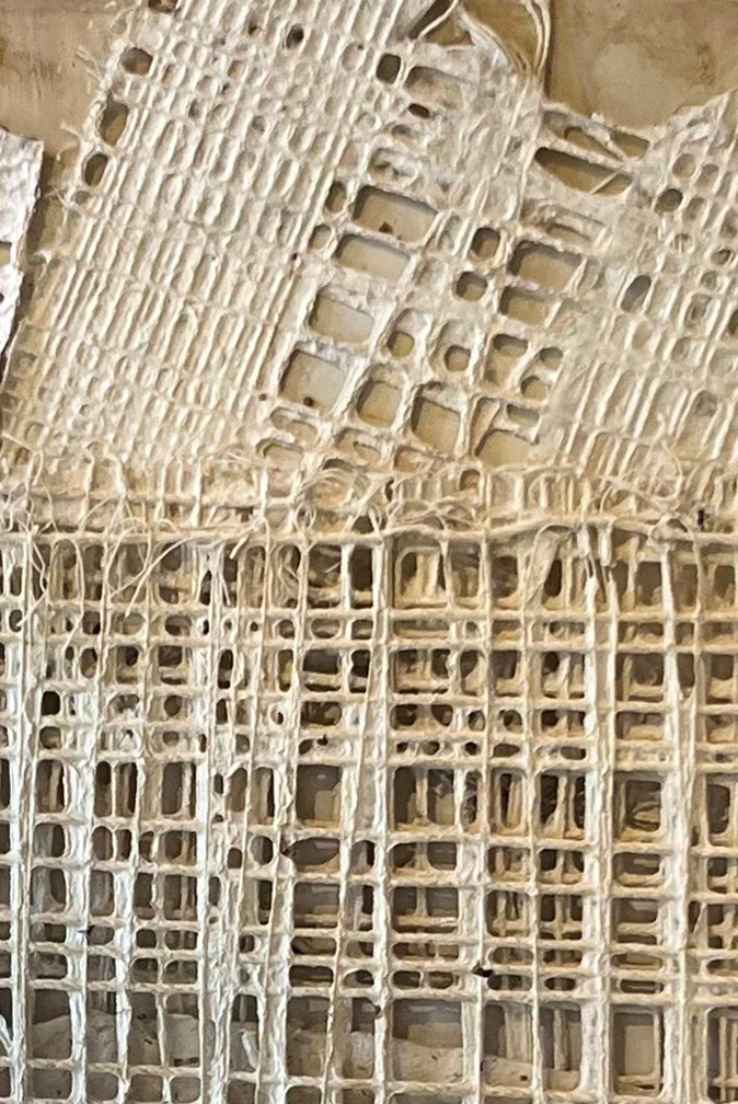 Obra hecha con pintura a la tiza, óxidos, algodones, hilo de algodón, pintura acrílica, tinta de urubú, pátinas óxido.