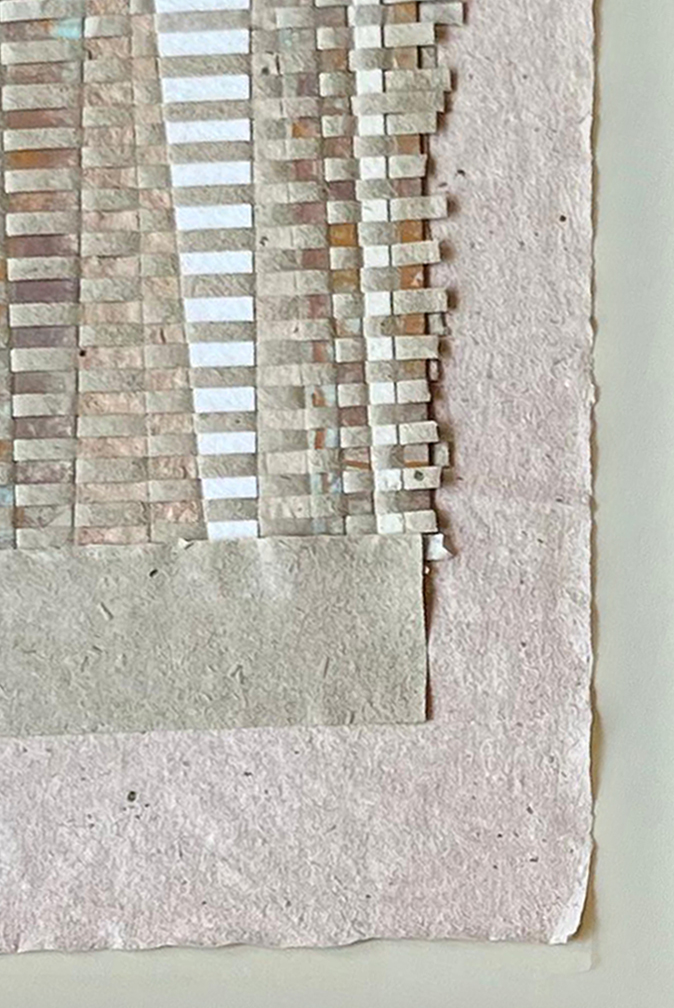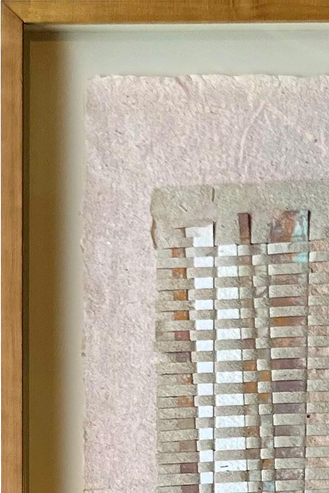 Obra realizada sobre papel artesanal de fibras naturales, elaborada mediante procesos manuales y técnicas tradicionales. La pieza explora la superposición de tramas, texturas y materiales orgánicos, dando lugar a variaciones únicas en cada composición. El resultado pone en valor la materialidad, el proceso y la singularidad de cada obra.