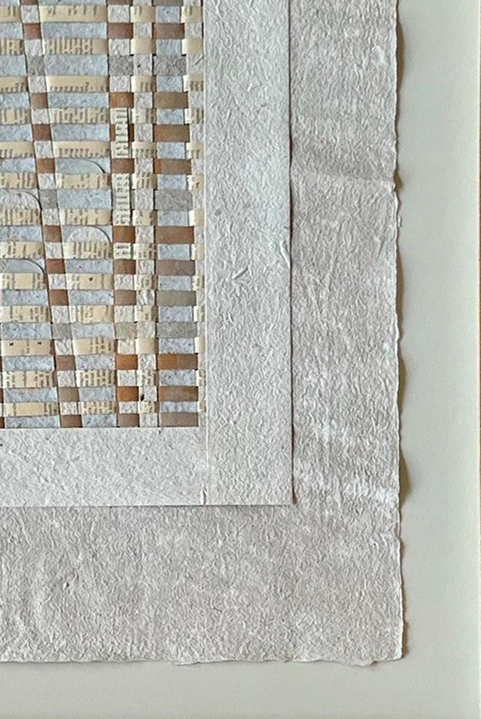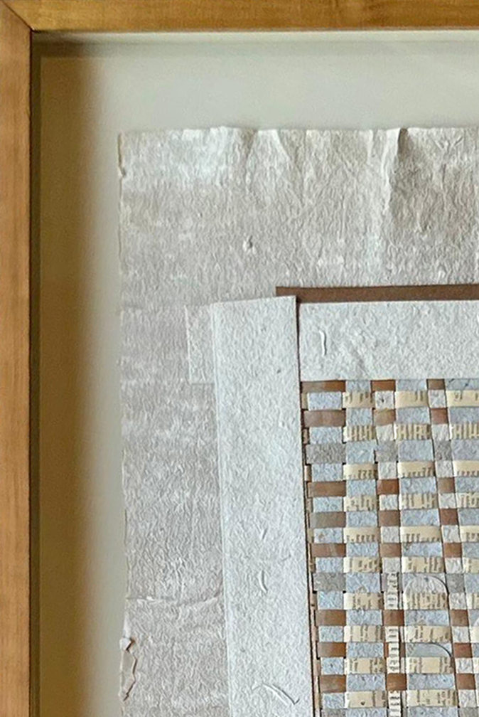 Obra realizada sobre papel artesanal de fibras naturales, elaborada mediante procesos manuales y técnicas tradicionales. La pieza explora la superposición de tramas, texturas y materiales orgánicos, dando lugar a variaciones únicas en cada composición. El resultado pone en valor la materialidad, el proceso y la singularidad de cada obra.