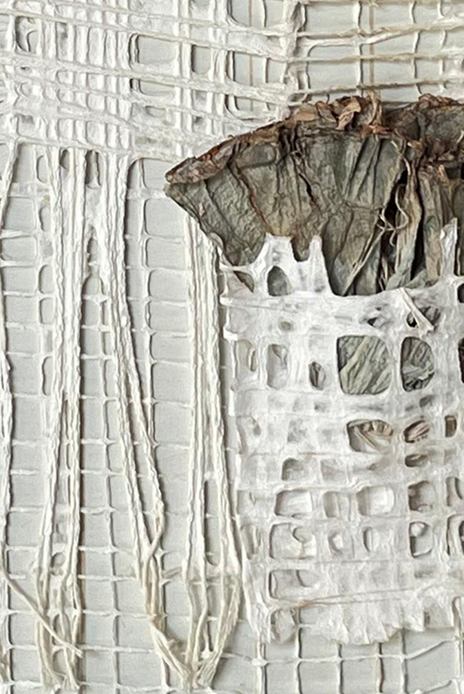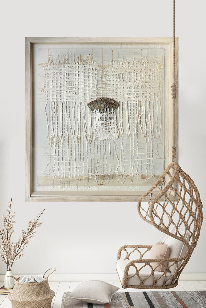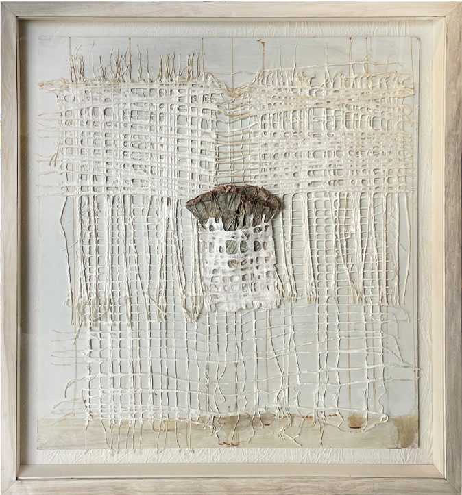 Obra hecha con pulpa de algodon 100%, hilos de algodón de mercería, base acrílica y tinte de algarrobo.