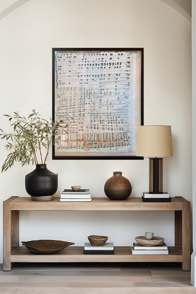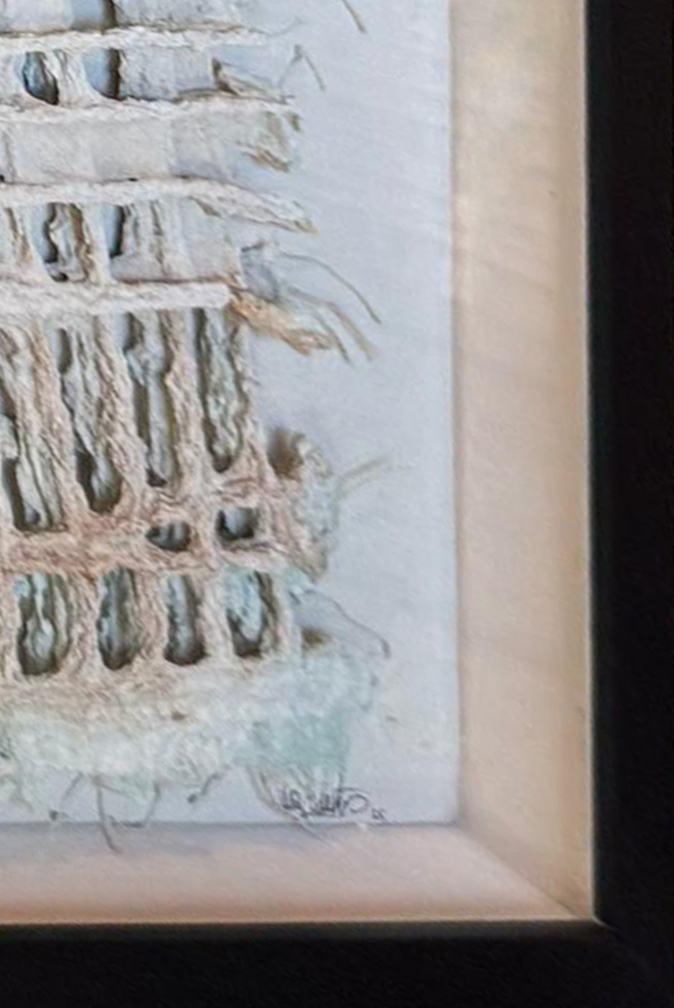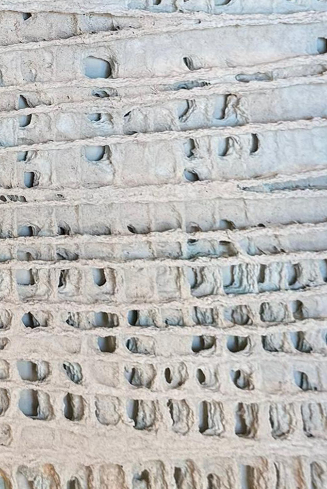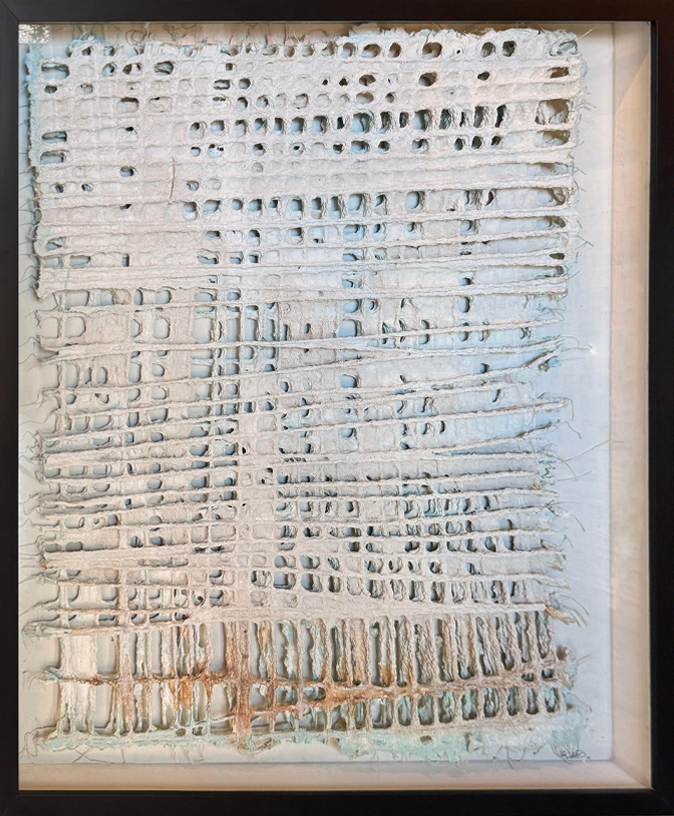 Obra hecha con madera, yeso, gouach blanco, reciclado de MDF, algodón, pintura Amanecer mate.