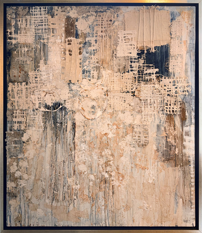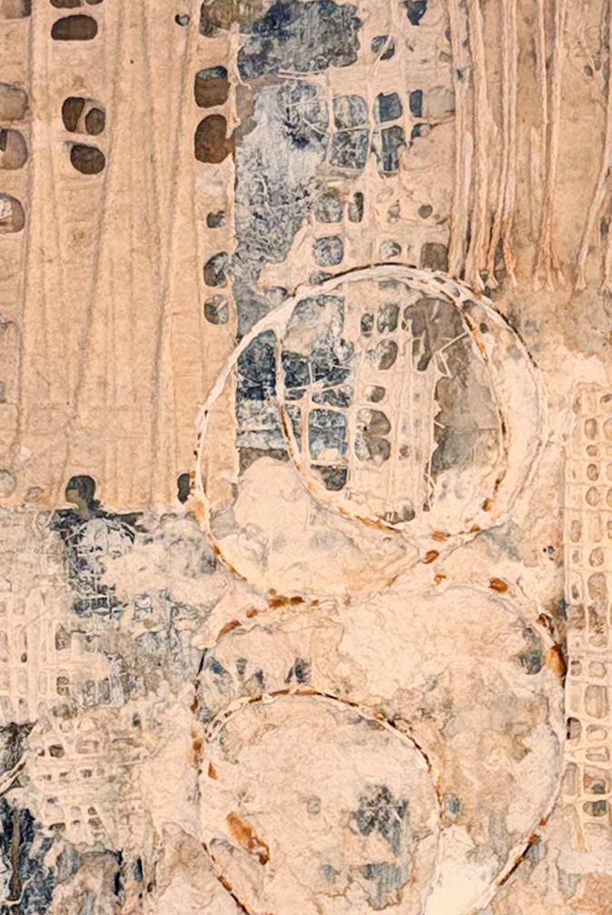 Obra hecha con papeles artesanales hechos a mano con fibra de algodón, pigmentos naturales blancos, óxidos, carbonilla, pintura gouach, pintura a la tiza, pulpas de algodón, Karaguatá, reciclados y bananero.