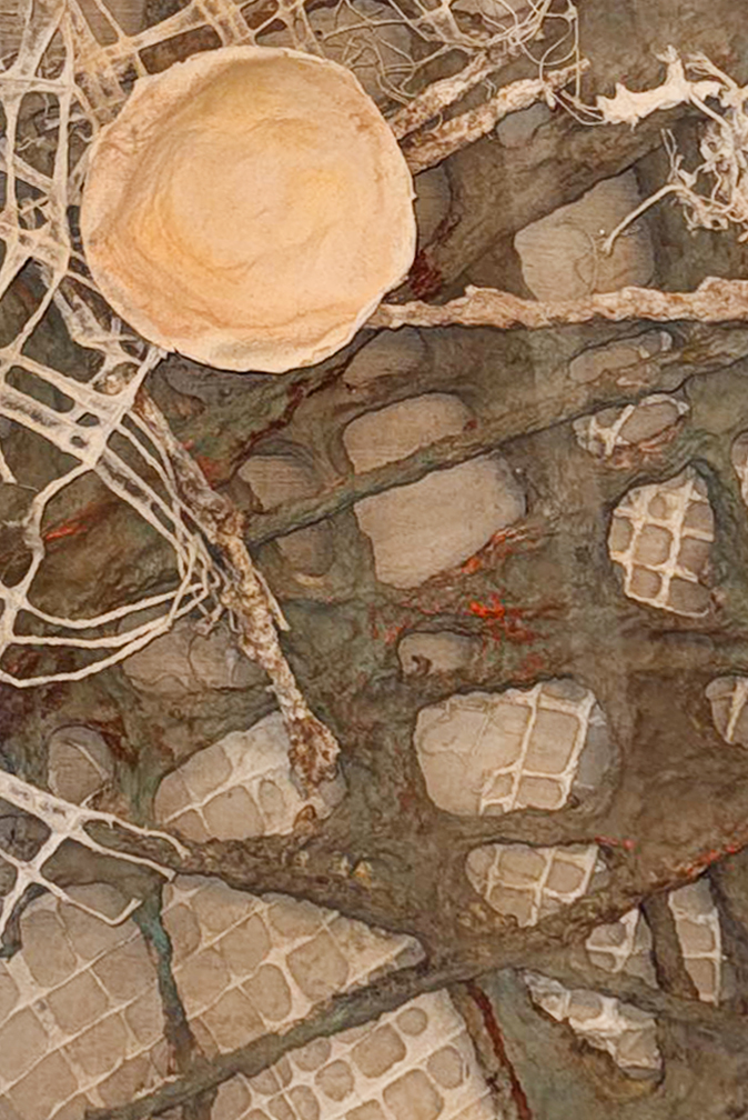 Obra hecha con madera, papeles artesanales hechos a mano con fibra de algodón, pigmentos naturales blancos , óxidos, carbonilla, pintura gouach. Pintura a la tiza. pulpas de algodón, Karaguatá, reciclados y bananero.