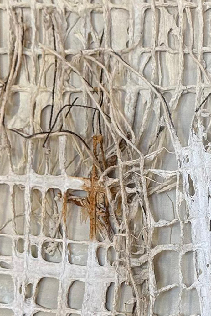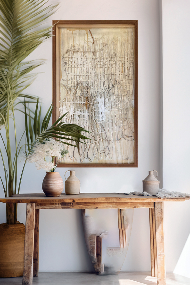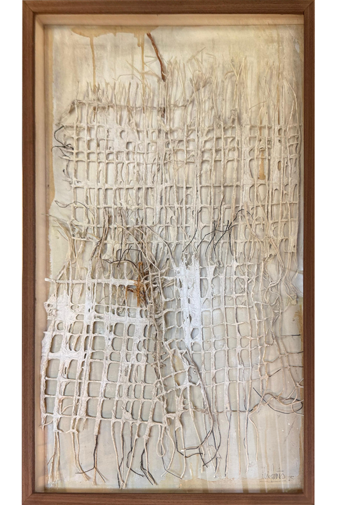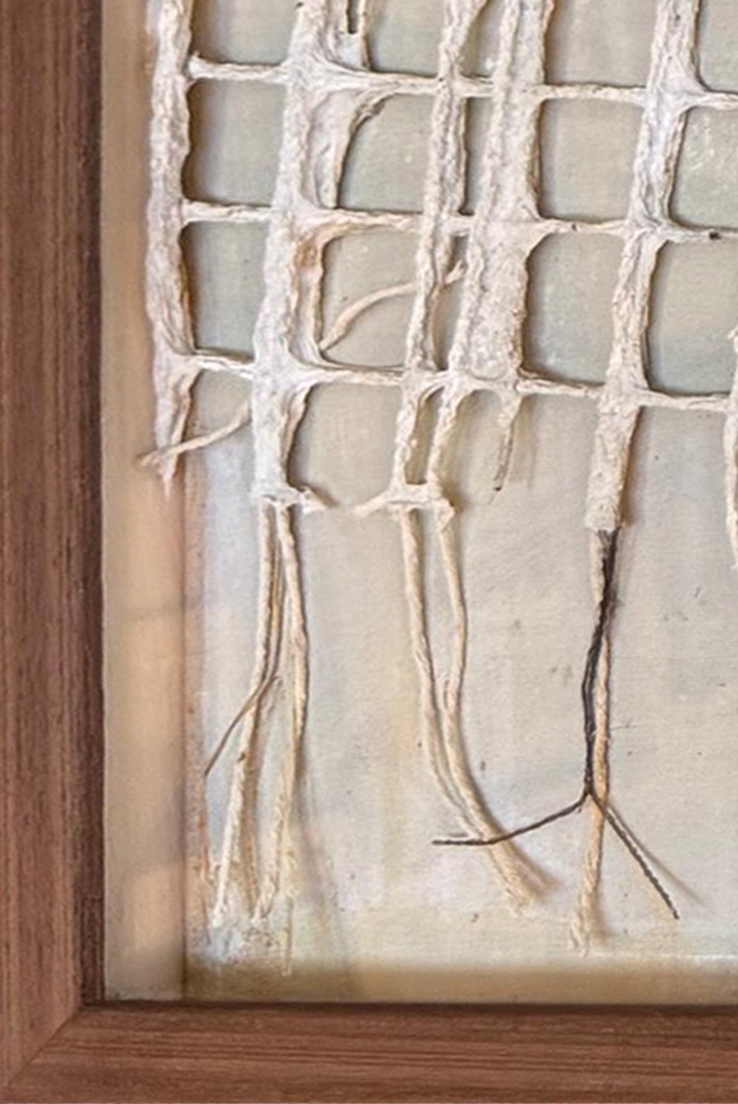 Obra hecha con papeles artesanales hechos a mano con fibra de algodón, pigmentos naturales blancos, oxidos, carbonilla, pintura gouach, y pintura a la tiza.