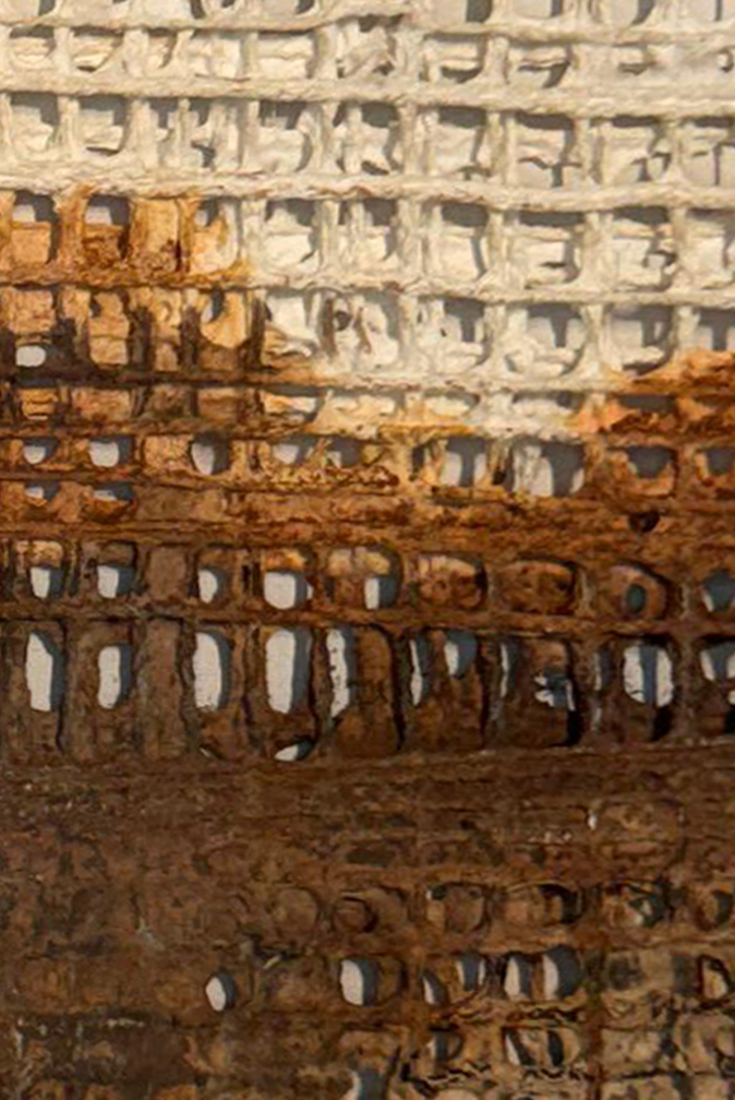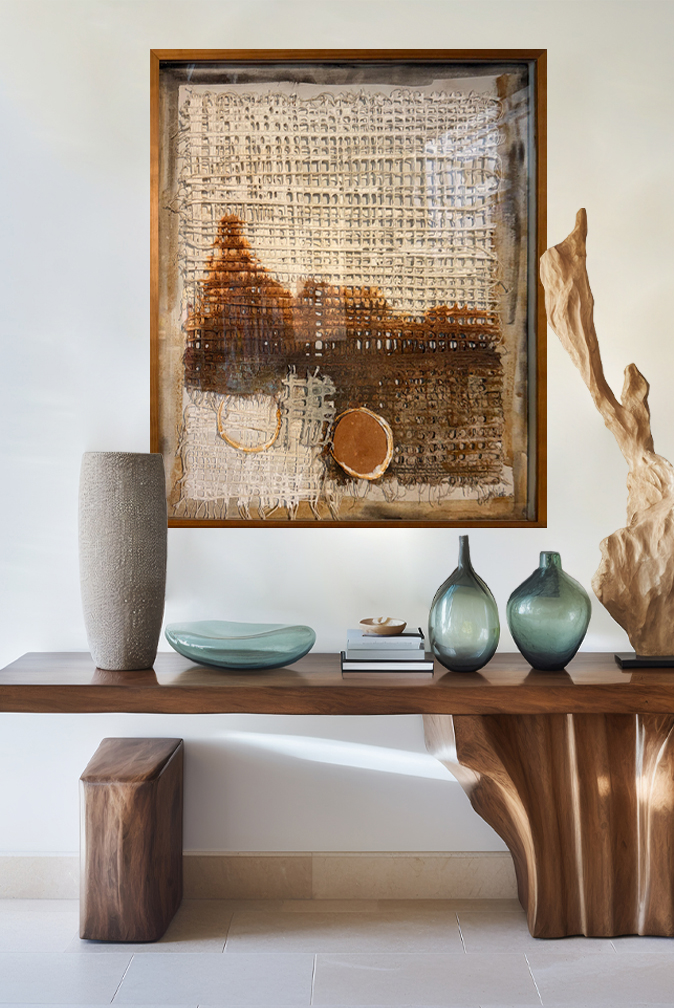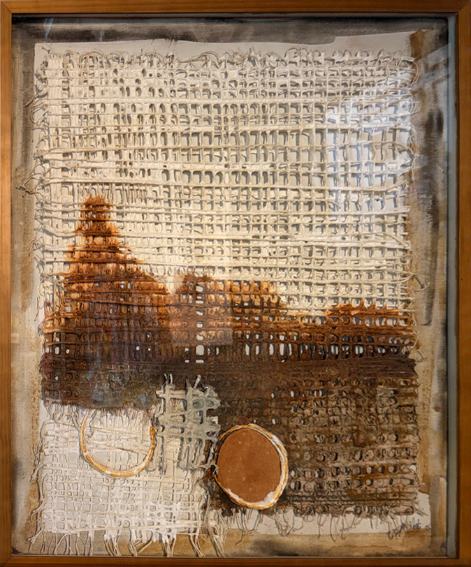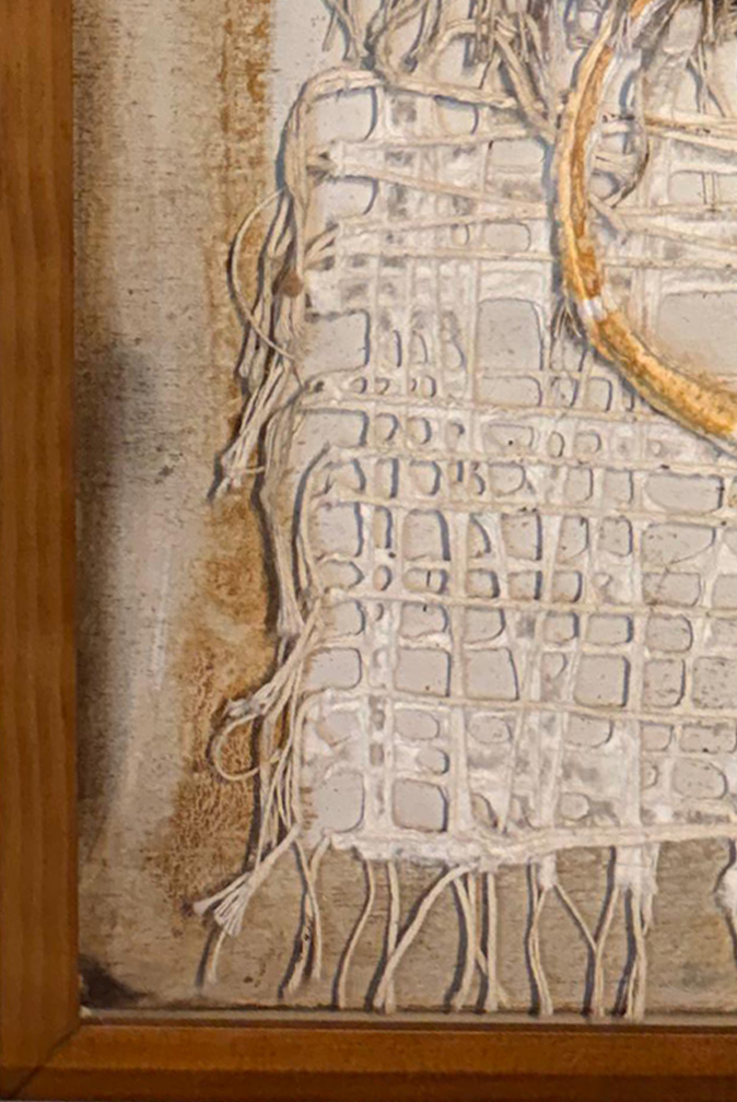 Obra hecha con Madera, pigmentos naturales blancos , óxidos, carbonilla, pintura gouach, pintura a la tiza. pulpas de algodón, Karaguatá y bananero.