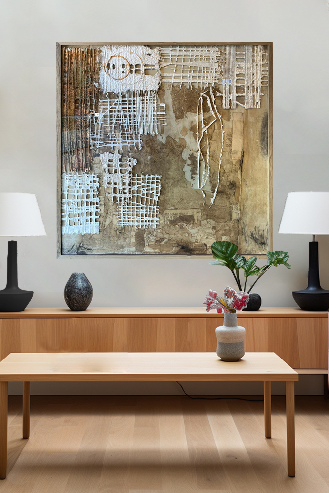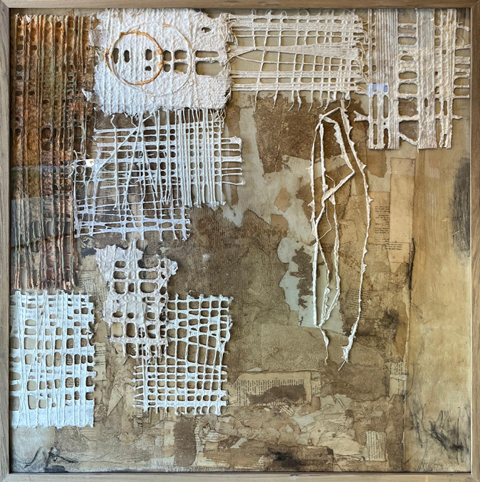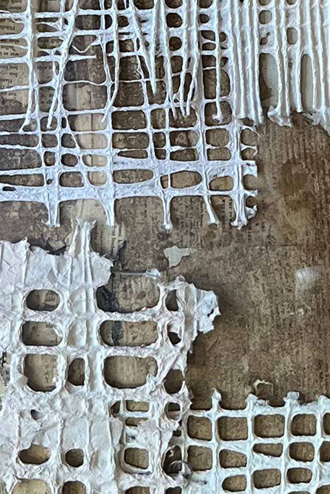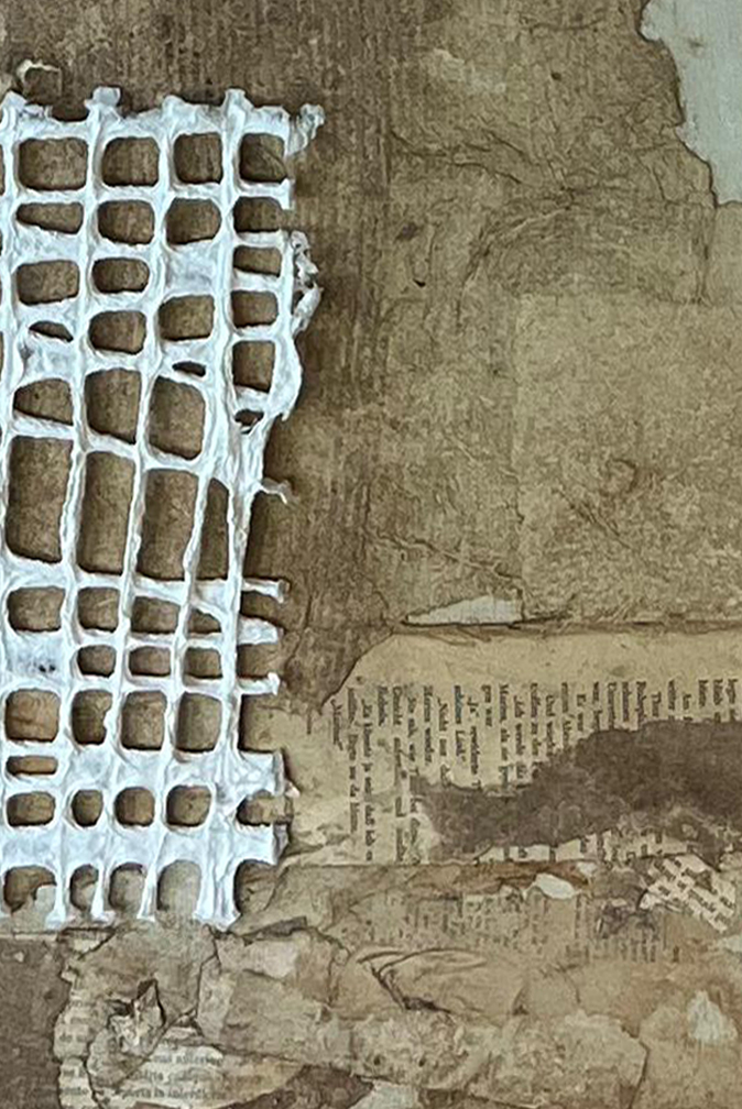 Obra hecha con pulpas de algodon, caraguata y reciclado. Pigmento índigo y pintura a la tiza, acrílicos, Papeles artesanales, óxidos y barniz.