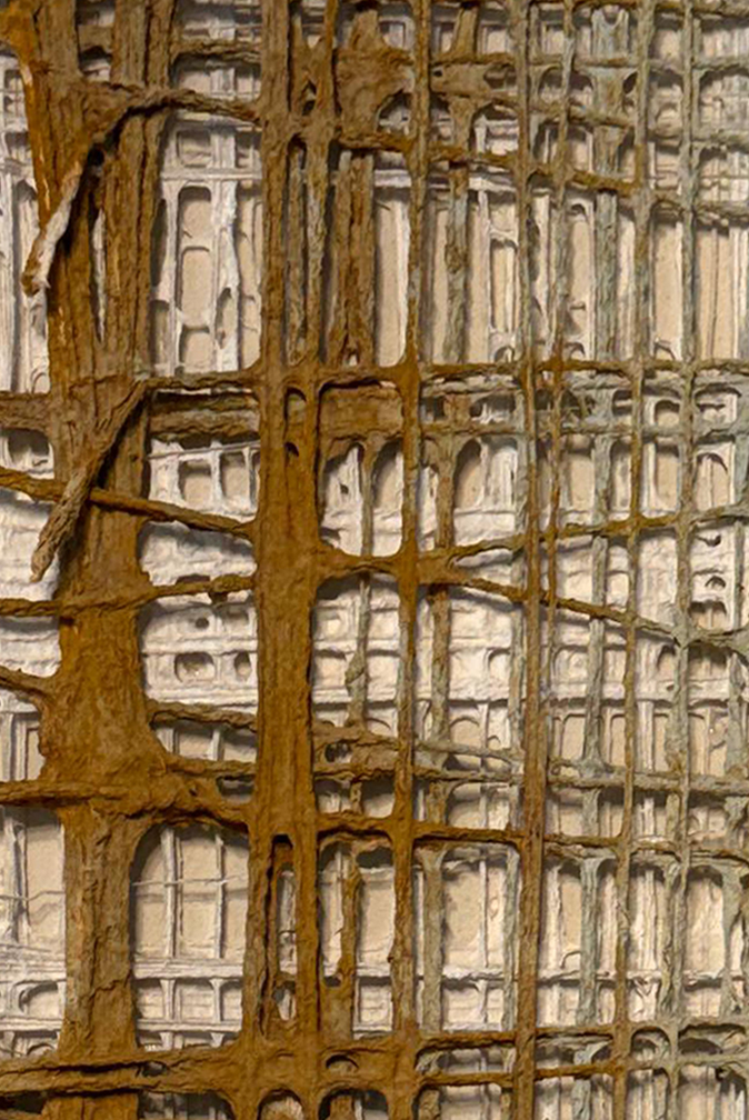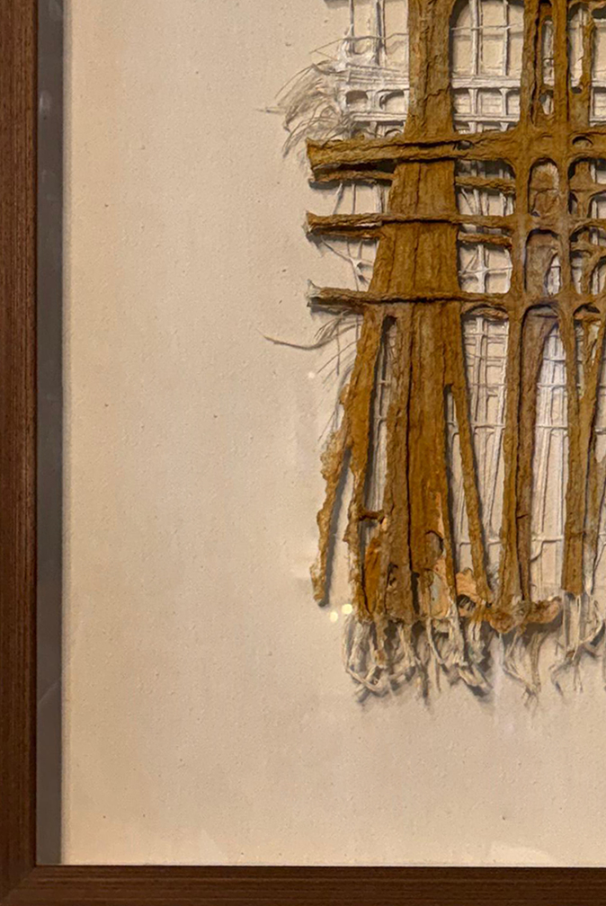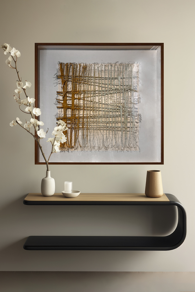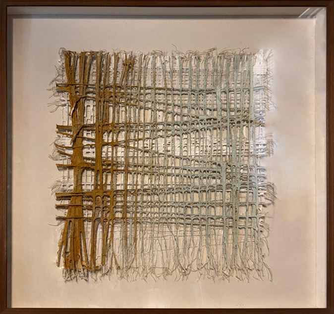 Obra hecha con óxido, tramas de fibras de algodón y trama de fibra de algodón pintada con gouach, pintura a la tiza, pigmentos naturales de color tiza, crema y marrones claros.