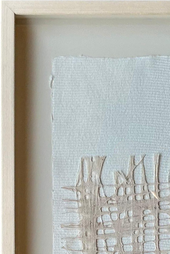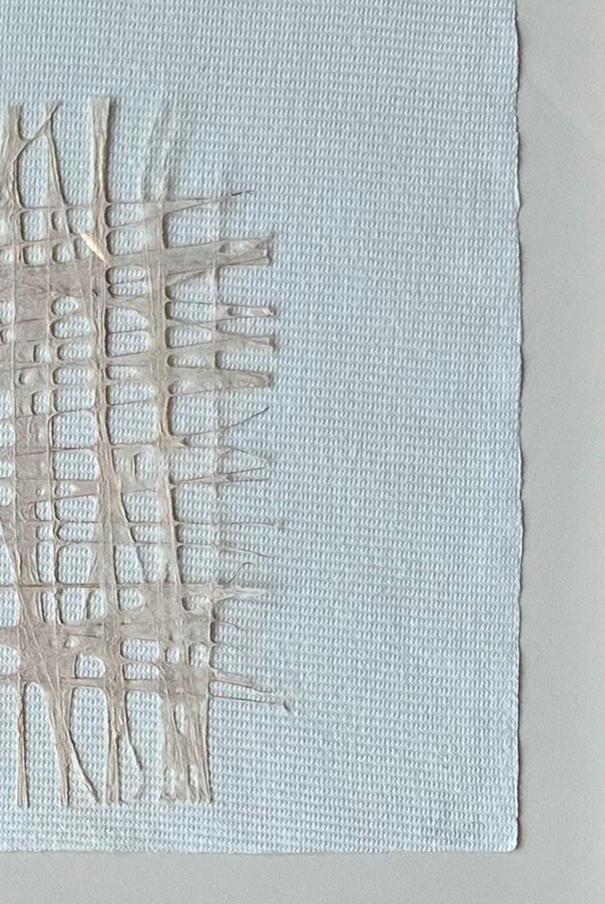 Obra realizada sobre papel artesanal de fibras naturales, elaborada mediante procesos manuales y técnicas tradicionales. La pieza explora la superposición de tramas, texturas y materiales orgánicos, dando lugar a variaciones únicas en cada composición. El resultado pone en valor la materialidad, el proceso y la singularidad de cada obra.
