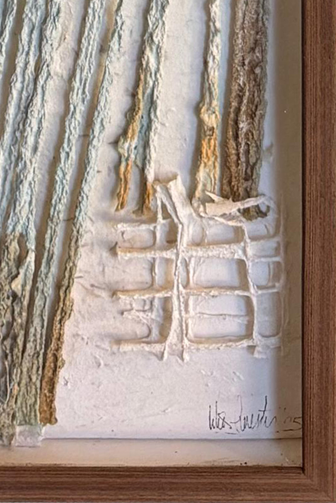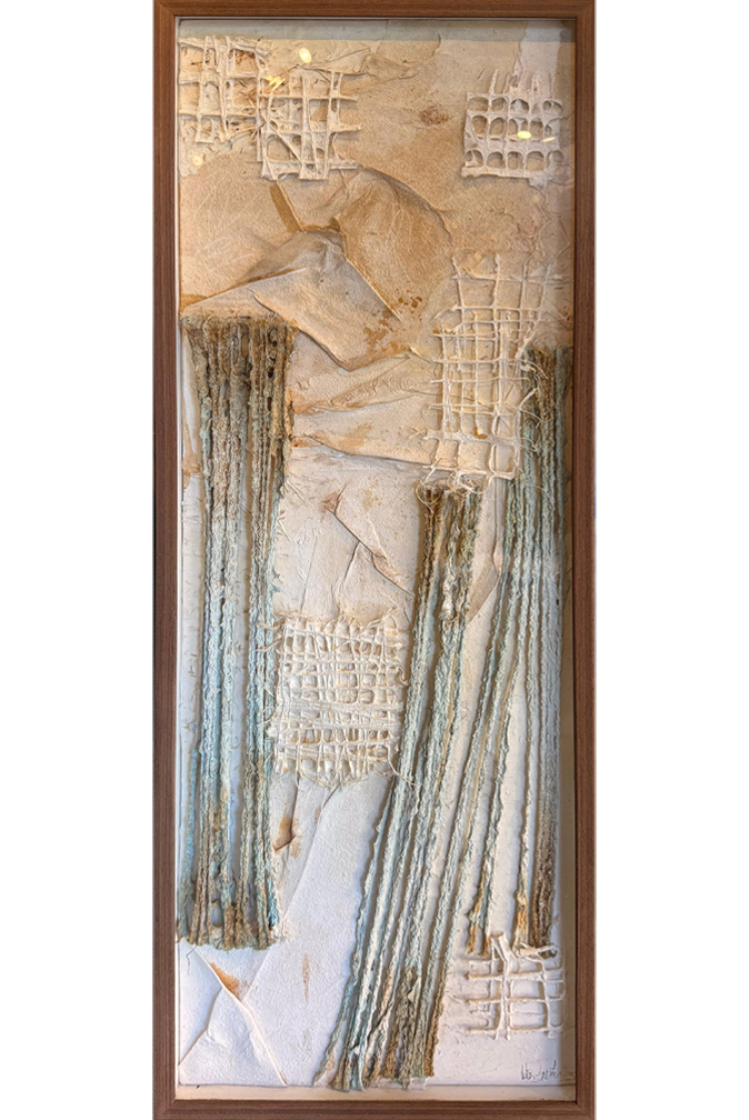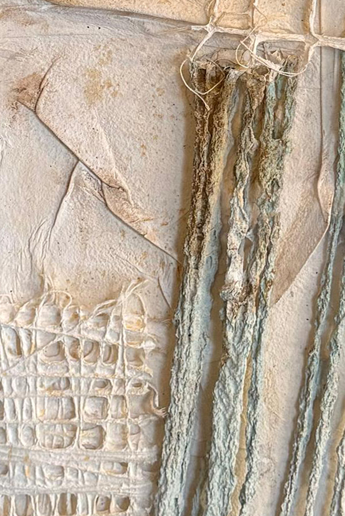 Obra hecha con papeles artesanales hechos a mano con fibra de algodón, pigmentos naturales blancos, , óxidos, carbonilla, pintura gouach y pintura a la tiza.