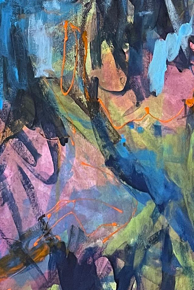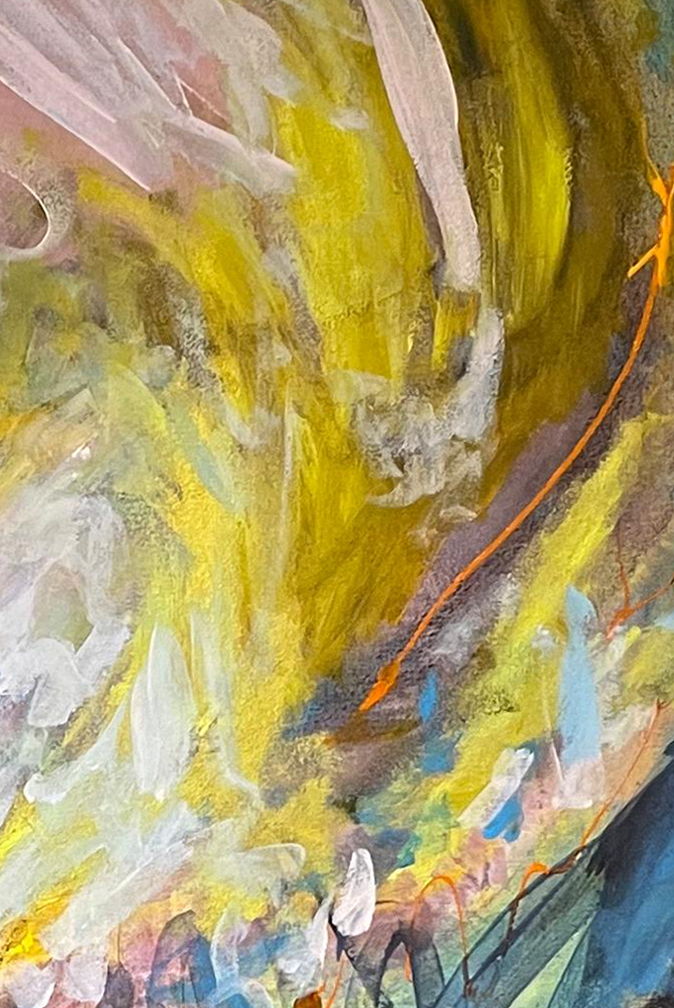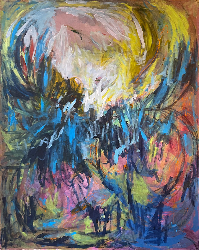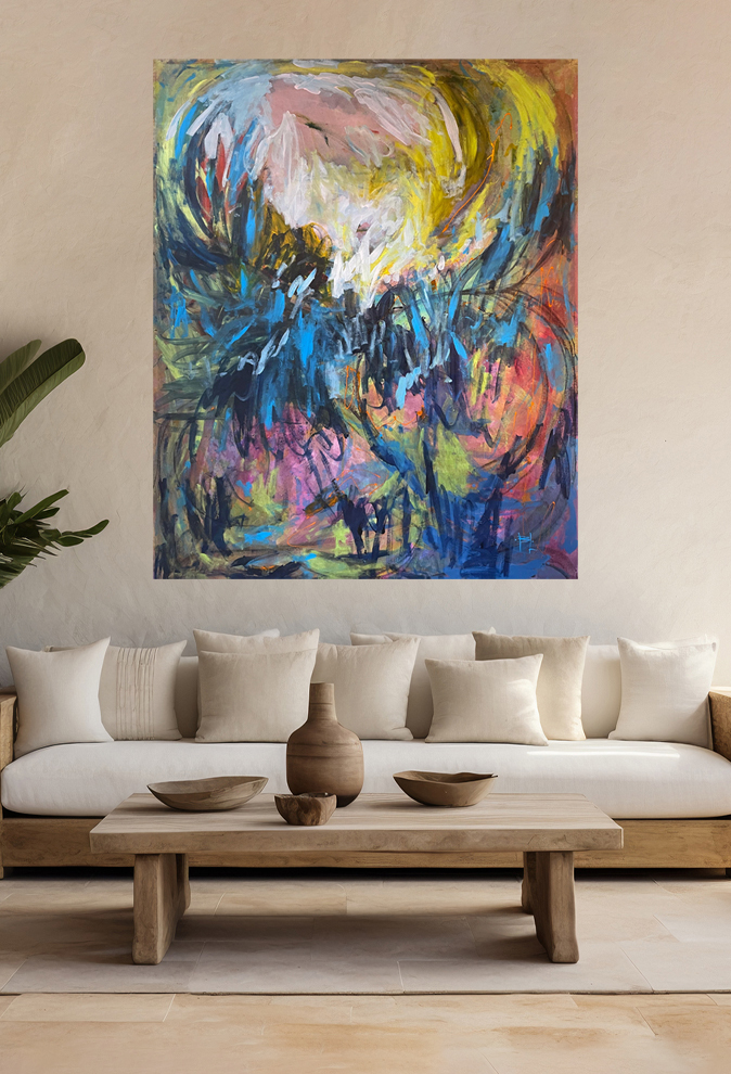 Obra hecha sobre lienzo utilizando pintura acrílica, tiza y óleo pastel.